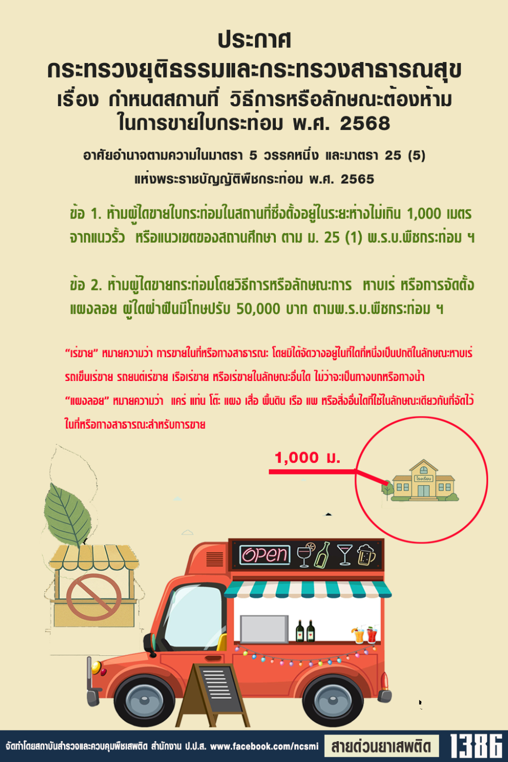 สำนักงานคณะกรรมการป้องกันและปราบปรามยาเสพติด ได้ออกประกาศกระทรวงยุติธรรมและกระทรวงสาธารณสุข เรื่อง กำหนดสถานที่ วิธีการ หรือลักษณะต้องห้ามในการขายใบกระท่อม พ.ศ. ๒๕๖๘ ลงวันที่ ๑๑ กันยายน พ.ศ. ๒๕๖๘ ซึ่งออกตามความในมาตรา ๕ วรรคหนึ่ง และมาตรา ๒๕ (๕) แห่งพระราชบัญญัติพืชกระท่อม พ.ศ. ๒๕๖๕ และได้ประกาศ ในราชกิจจานุเบกษา เล่ม ๑๔๒ ตอนพิเศษที่ ๓๐๓ ง เมื่อวันที่ ๑๒ กันยายน ๒๕๖๘ ทั้งนี้ ขอให้องค์กรปกครองส่วนท้องถิ่นทราบและถือปฏิบัติ รายละเอียดตามเอกสารที่แนบมาพร้อมนี้