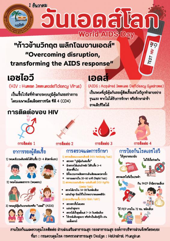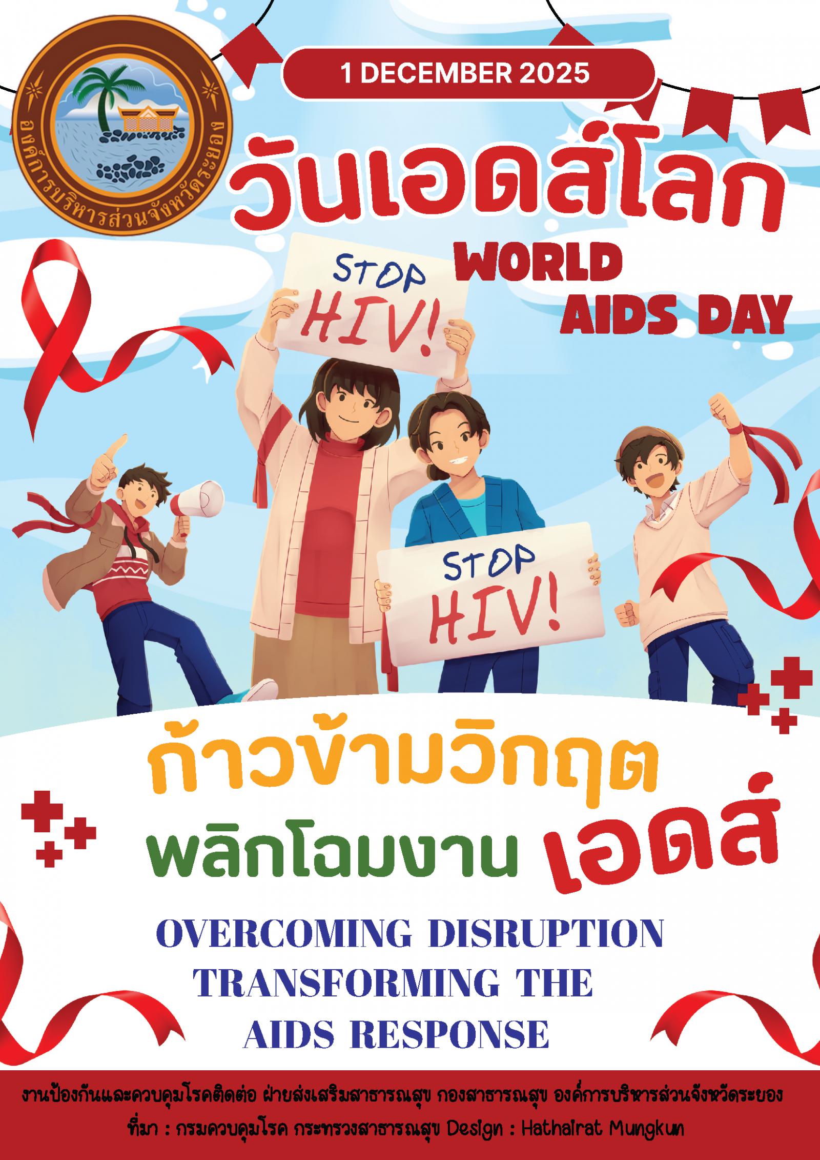 ด้วยองค์การอนามัยโลกกำหนดให้วันที่ ๑ ธันวาคม ของทุกปี เป็นวันเอดส์โลก(World AIDS Day) กระทรวงสาธารณสุข จึงได้รณรงค์สร้างความตระหนักถึงความสำคัญของการป้องกันโรคเอดส์ ยอมรับและเข้าใจผู้ติดเชื้อเอชไอวีทั่วโลกและให้ทุกคนได้ตระหนักถึงอันตรายจากการติดต่อและการเจ็บป่วยด้วยโรคเอดส์ รวมทั้งเผยแพร่ความรู้เกี่ยวกับโรคเอดส์ให้กว้างขวางยิ่งขึ้นและสามารถนำความรู้ไปใช้ในชีวิตประจำวันได้อย่างถูกต้องปลอดภัย และทำการเสริมสร้างและสนับสนุนให้มีมาตรการการป้องกันให้มากขึ้นในสังคมทุกระดับ กระทรวงสาธารณสุข จึงขอเชิญหน่วยงานทุกภาคส่วนร่วมกันเรียกร้องให้มีภาวะผู้นำทางการเมืองอย่างต่อเนื่อง การร่วมมือระหว่างประเทศ และแนวทางที่ยึดหลักสิทธิมนุษธชน เพื่อยุติเอดส์ภายในปี พ.ศ. ๒๕๗๓ โดยในปี พ.ศ. ๒๕๖๘ มีคำขวัญวันเอดส์โลก คือ “ก้าวข้ามวิกฤต พลิกโฉมงานเอดส์” (Overcoming disruption, transforming the AIDS response) (ข้อมูล : ศูนย์รวมข้อมูลสถานการณ์ด้านเอชไอวีของประเทศไทย) รายละเอียดปรากฏตามเอกสารที่แนบมาพร้อมนี้